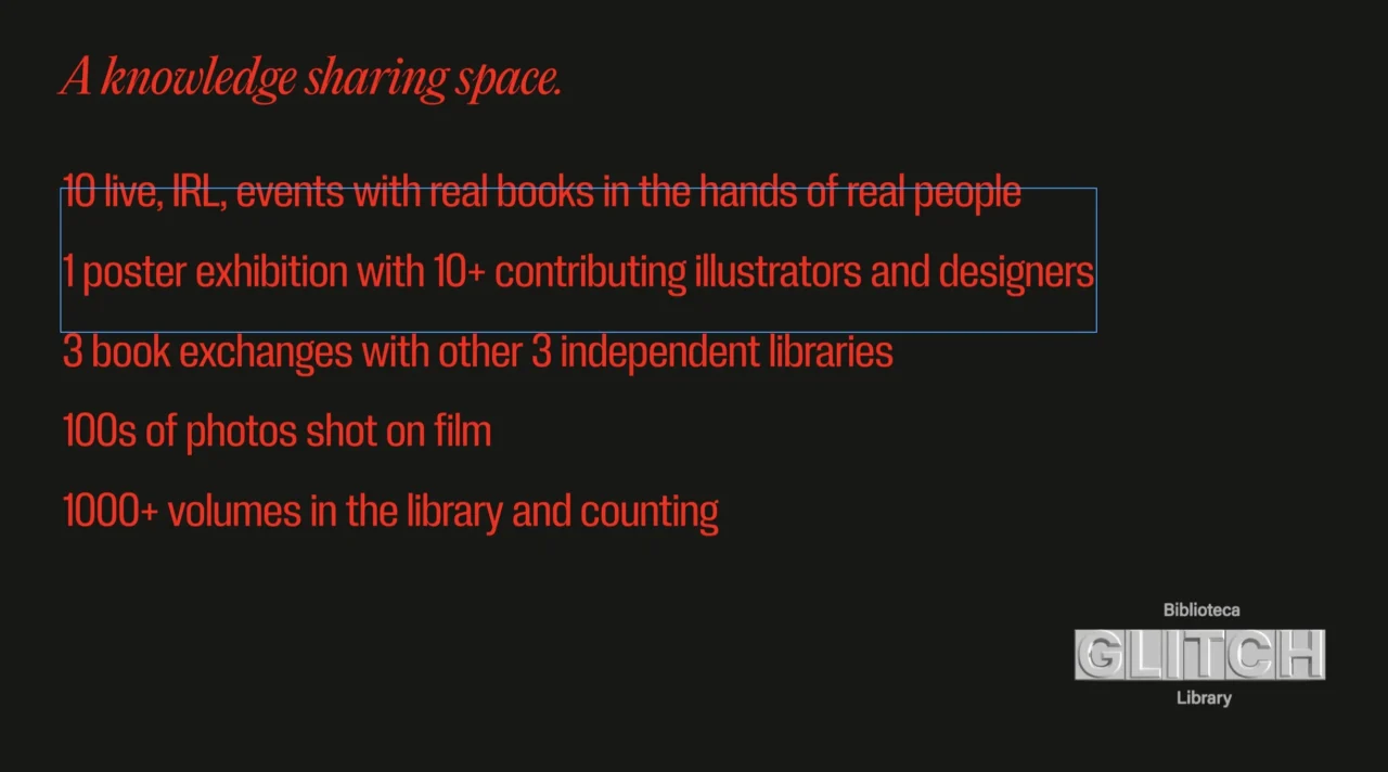 In a world that demands constant acceleration, slowness becomes subversive. Which is why Glitch built Biblioteca Glitch — a physical library of over a thousand books about design, culture, theory and art. No algorithms. No search bars. Just shelves, chairs, and people. Ten live events. A poster exhibition with ten artists. Book exchanges with three independent libraries. All shot on film.