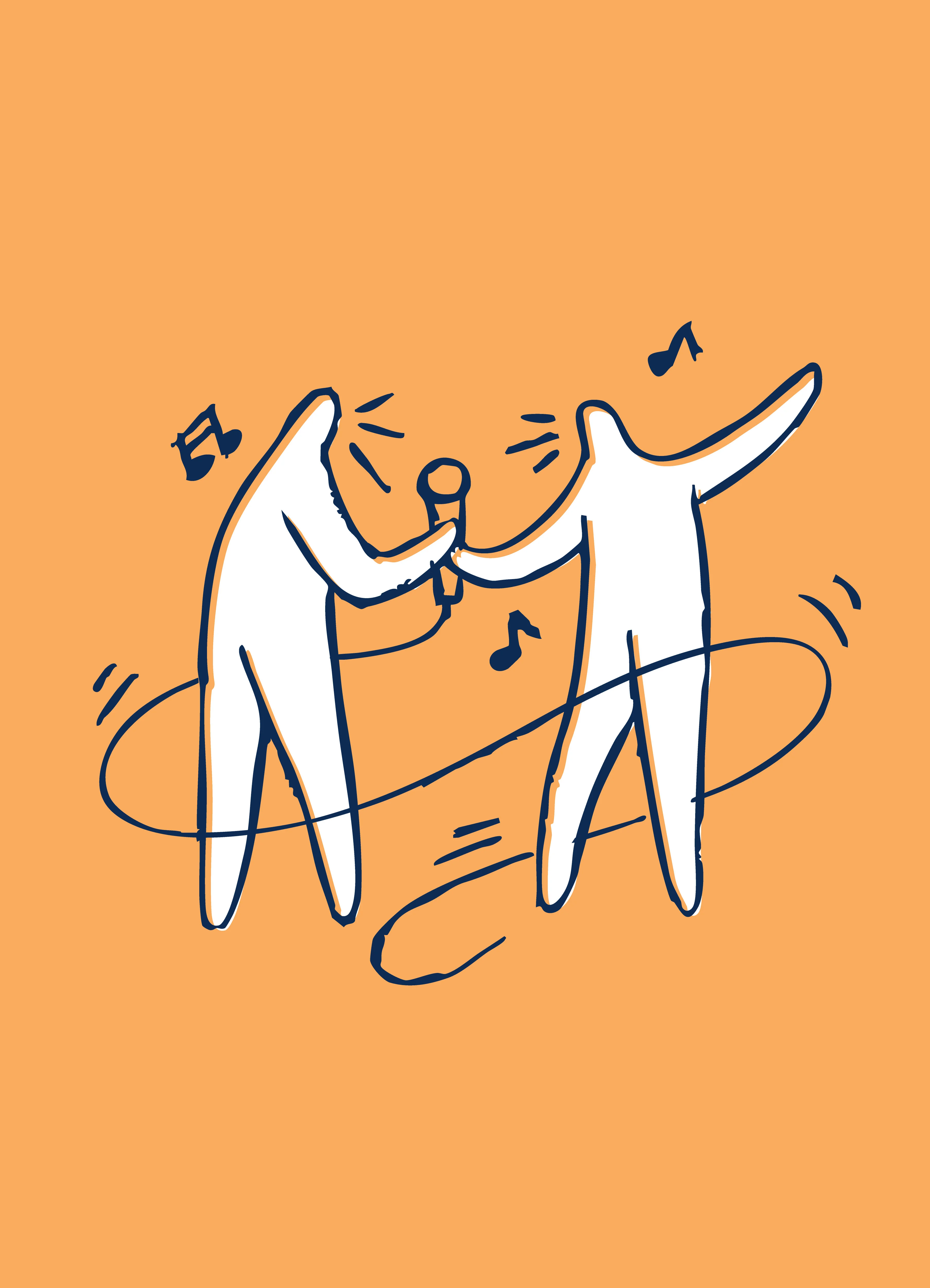 We developed a hand-drawn visual language: loose, textured ink lines on bold, saturated colour fields. Each theme carries its own palette. Yellow for museums. Green for music. Pink for visual arts. Blue for dance. Warm red for belonging. A small white figure moves through every world: climbing a musical score, surfing a brushstroke, falling into a canvas.