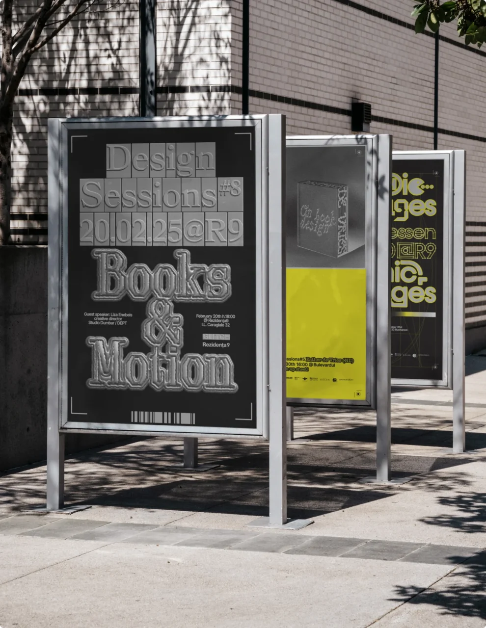 Design Sessions became our signature format: intimate talks where practitioners share process, not just outcomes. When Richard Niessen brought his traveling drawer of typographic experiments to Rezidența9, we crafted event communication that read like a well-curated mixtape: punchy headlines, essential details, zero pretension. The goal was always to shrink the distance between “maybe I’ll check it out” and “wouldn’t miss it.” Each session poster carries the library’s DNA while adapting to the guest’s aesthetic territory.